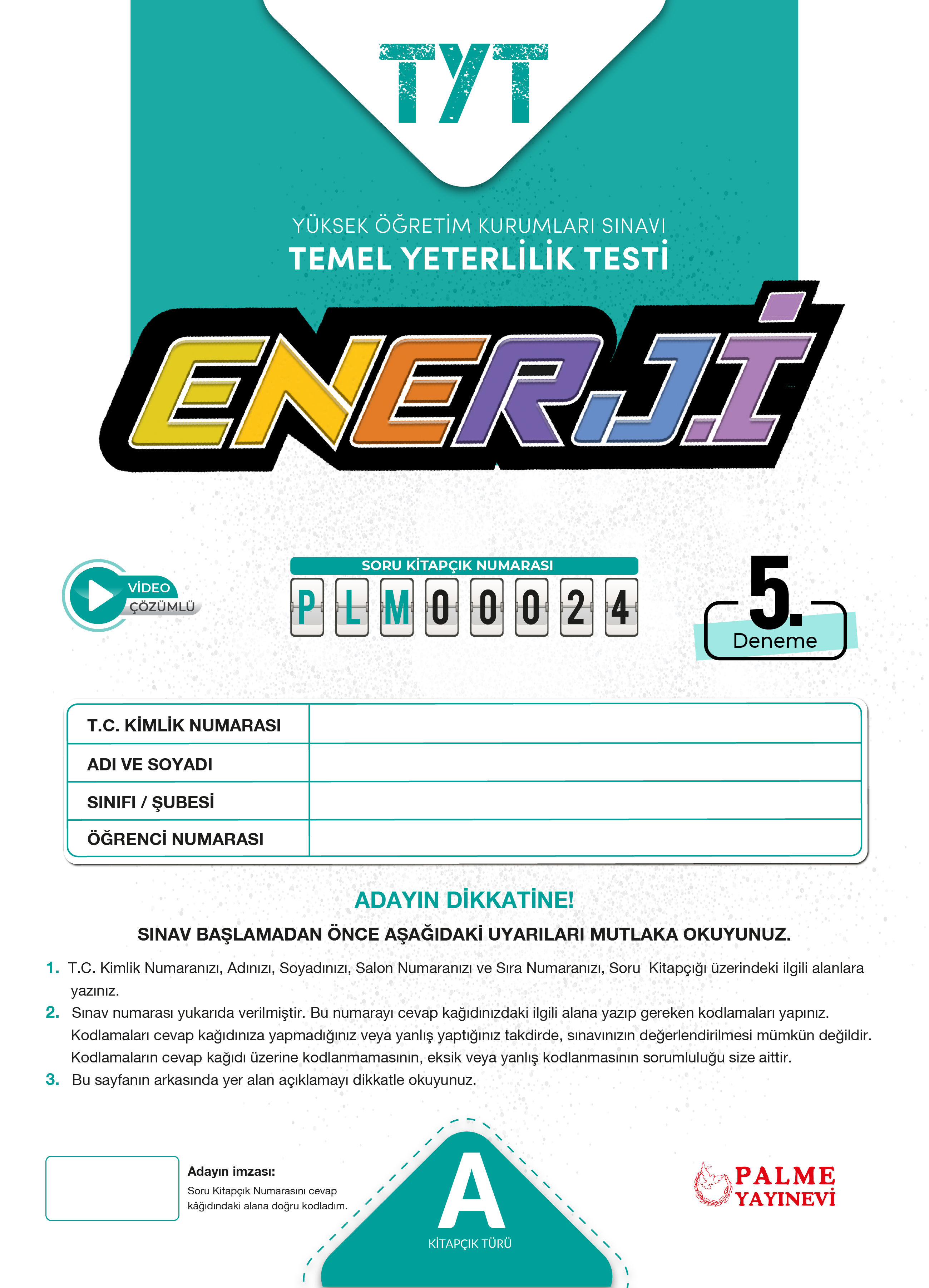 TYT Enerji Serisi 5. Deneme Sınavı A Kitapçığı*