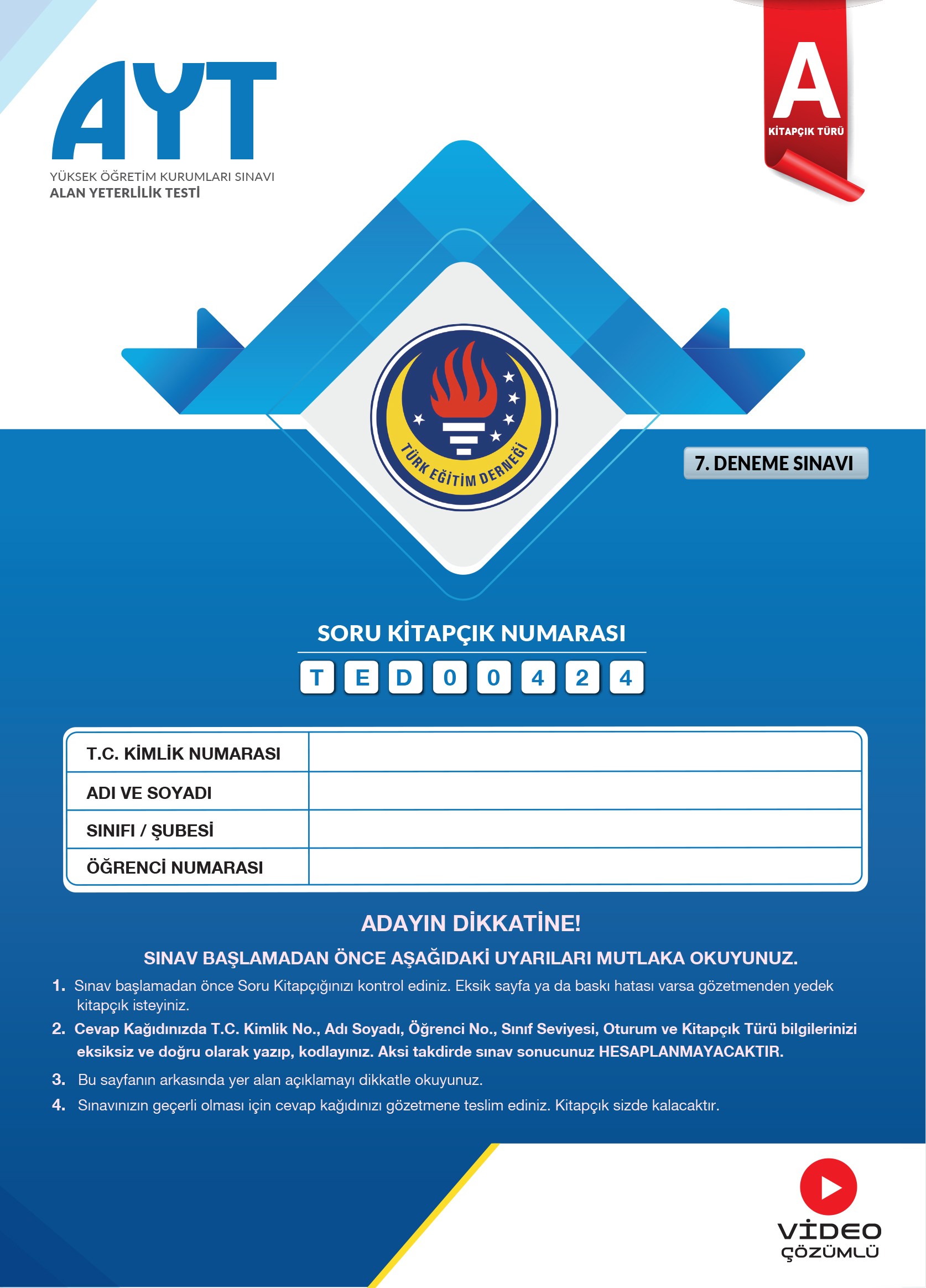 Türk Eğitim Derneği AYT Kurumsal Deneme 4-A Kitapçığı